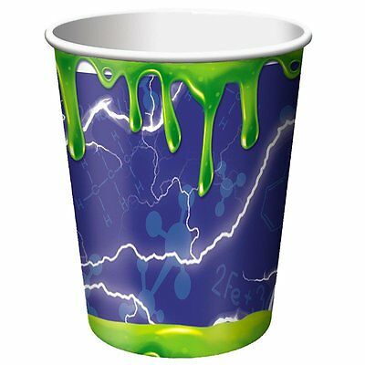 Mix up an experiment in these Mad Scientist 9oz Paper Cups! Featuring a electric current background with green slime borders. Each cup holds up to 9 ounces of your favorite hot or cold liquid.